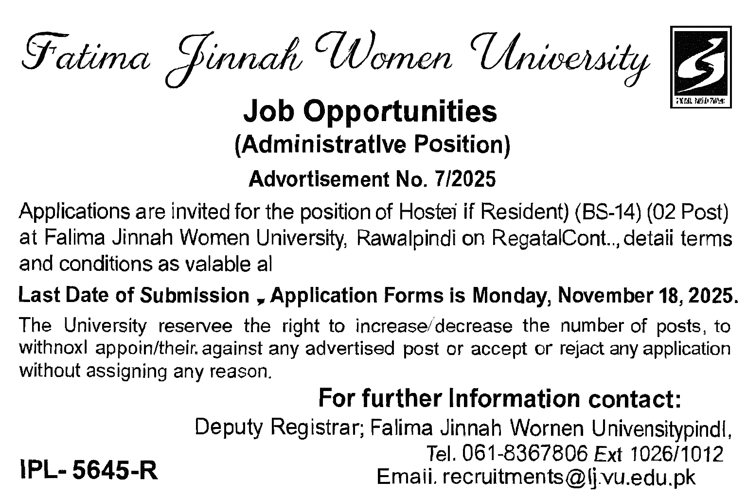 Apply now for the newest Government Education jobs ot other positions at Fatima Jinnah Women University Rawalpindi, before the last date which is November 18-2025, or the last date mentioned in the newspaper advertisement. click on the complete ad image online to learn more about the application process for the new Fatima Jinnah Women University job vecancies.