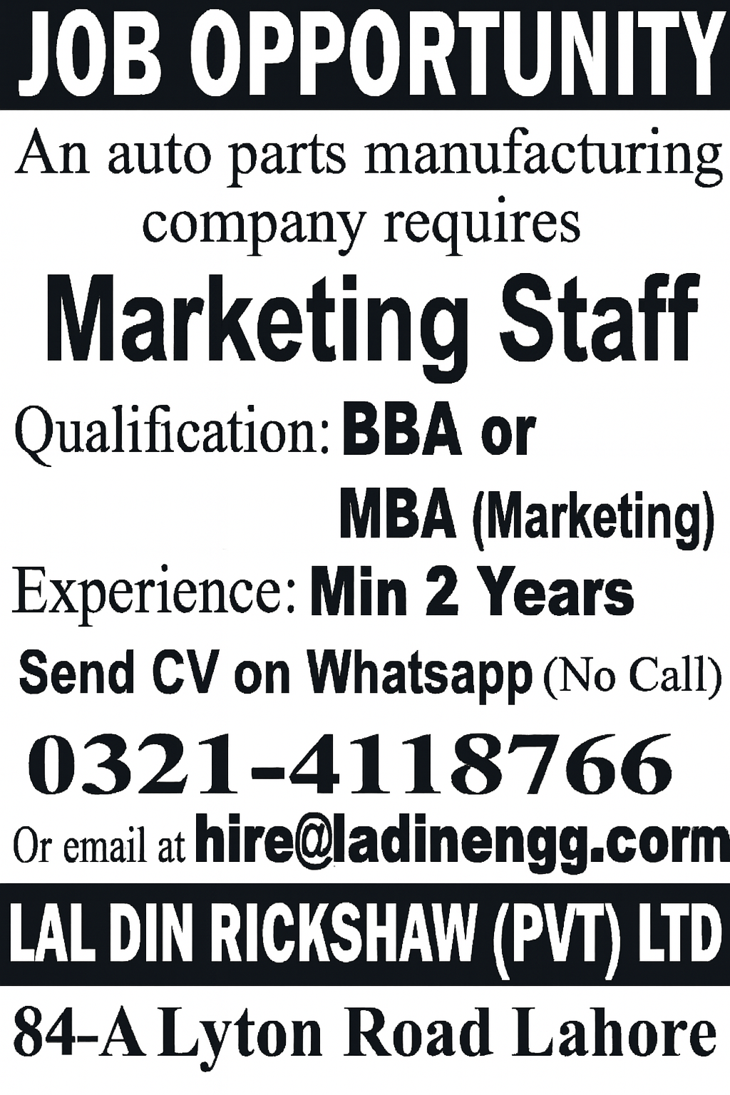Auto Parts Manufacturing Company, Lytton Road, Lahore Pakistan calling qualified applicants for the post of Markiting, the opportunity is announced in Daily Jang Newspaper on October 26-2025. Applicants with qualifications like Master’s, BBA, MBA, or Bachelor’s can get this opportunity.